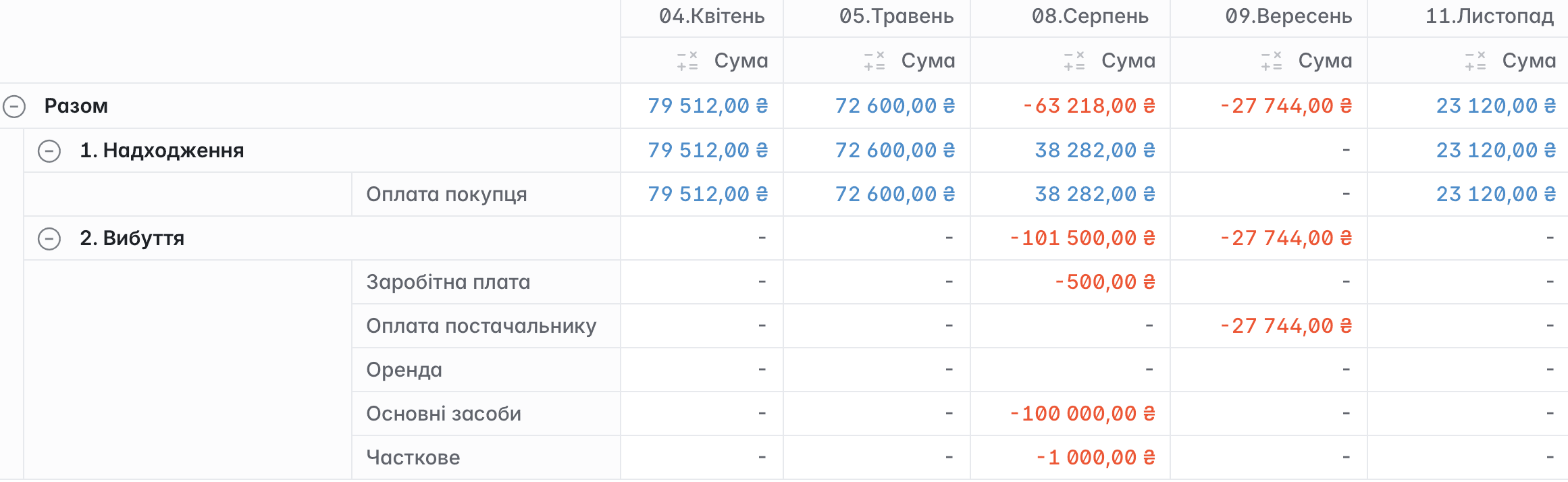 Усі ці операції формують єдиний потік фінансових даних, який дозволяє відстежувати кеш-флоу компанії без додаткових таблиць чи ручного зведення інформації.