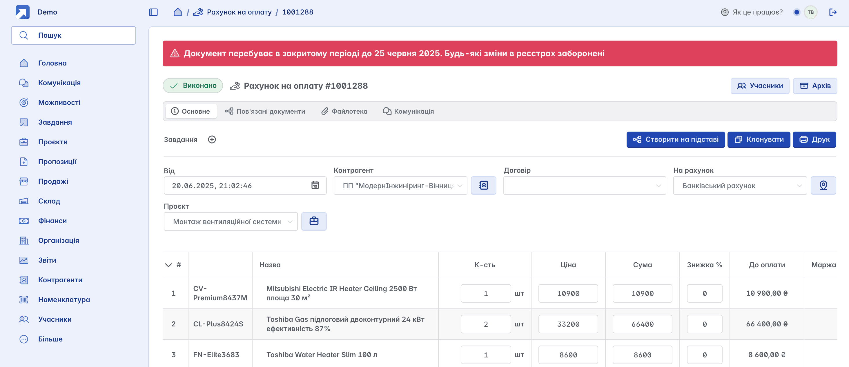 Суттєво покращили роботу з закритим періодом. Користувач буде бачити, якщо документ перебуває у закритому періоді. Також документи, що не впливають суттєво на дані (чернетки, резерви) можна відредагувати змінивши дату, що не входить у закритий період.