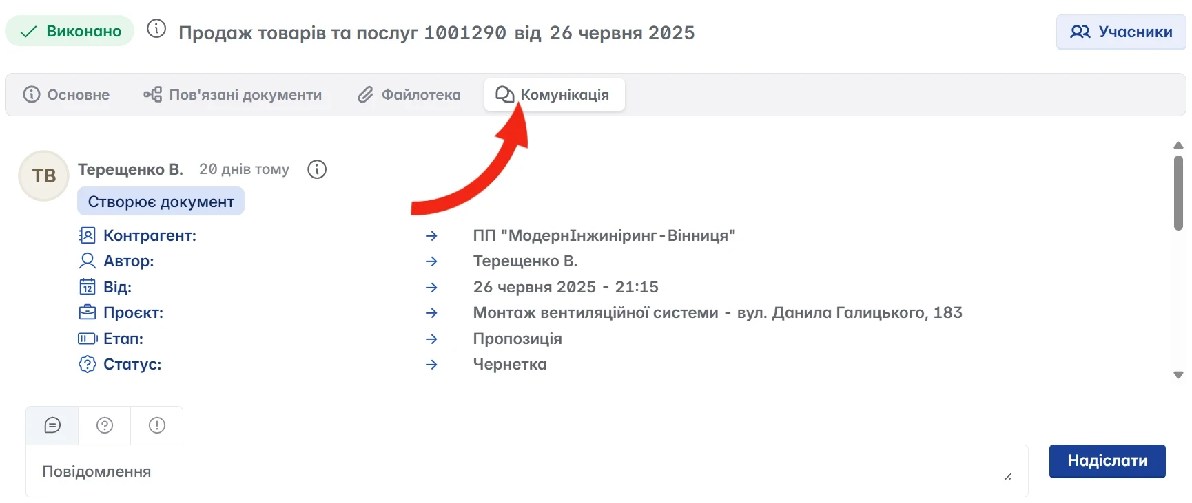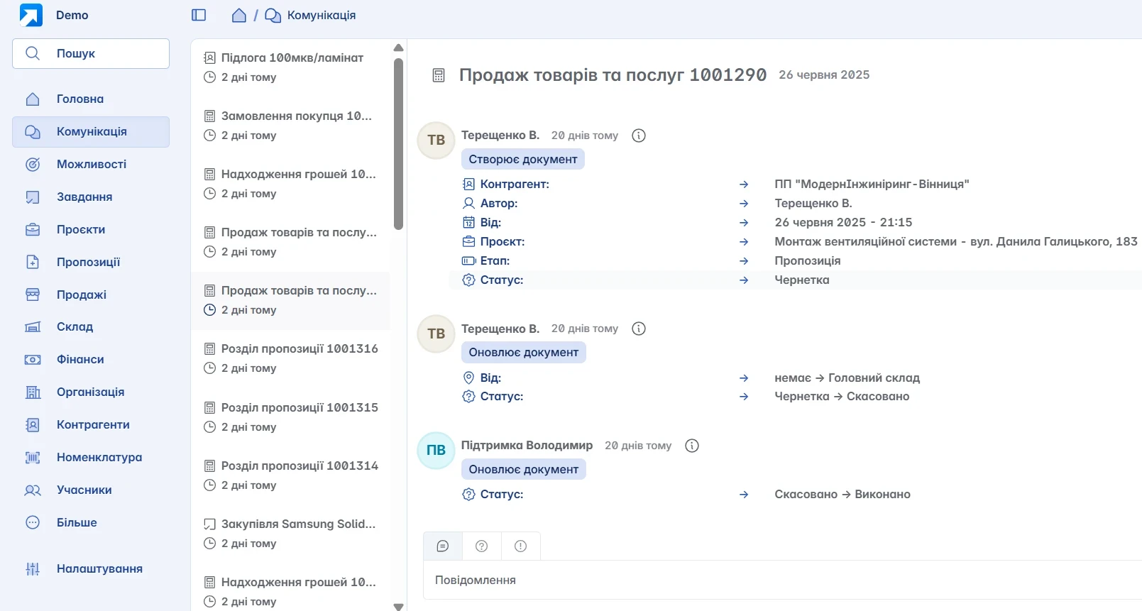 Якщо вас цікавить аудит змін стосовно конкретного запису (документ, контрагент тощо), потрібно відкрити цей запис та перейти у вкладку "Комунікація". За потреби цю вкладку можна прибрати у налаштуваннях.