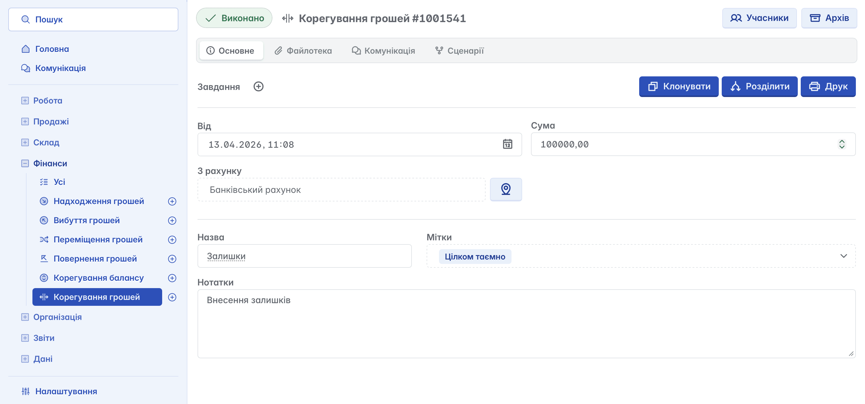 Для фінансового обліку в Керуй™ використовуються шість типів фінансових документів: "Надходження грошей", "Вибуття грошей", "Переміщення грошей", "Повернення грошей", "Корегування балансу" та "Корегування грошей"