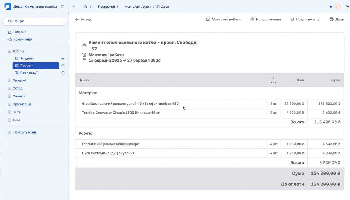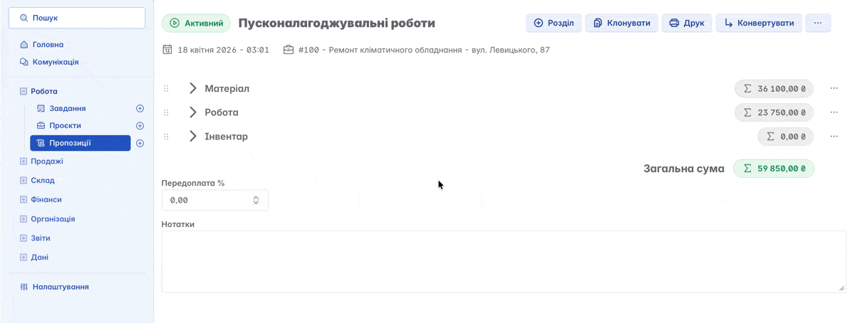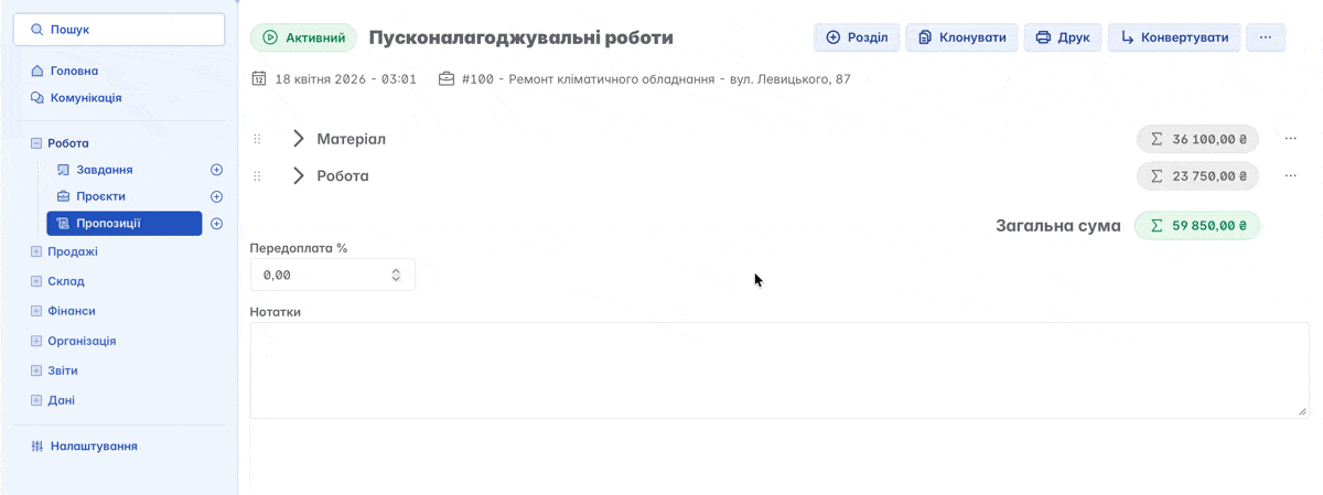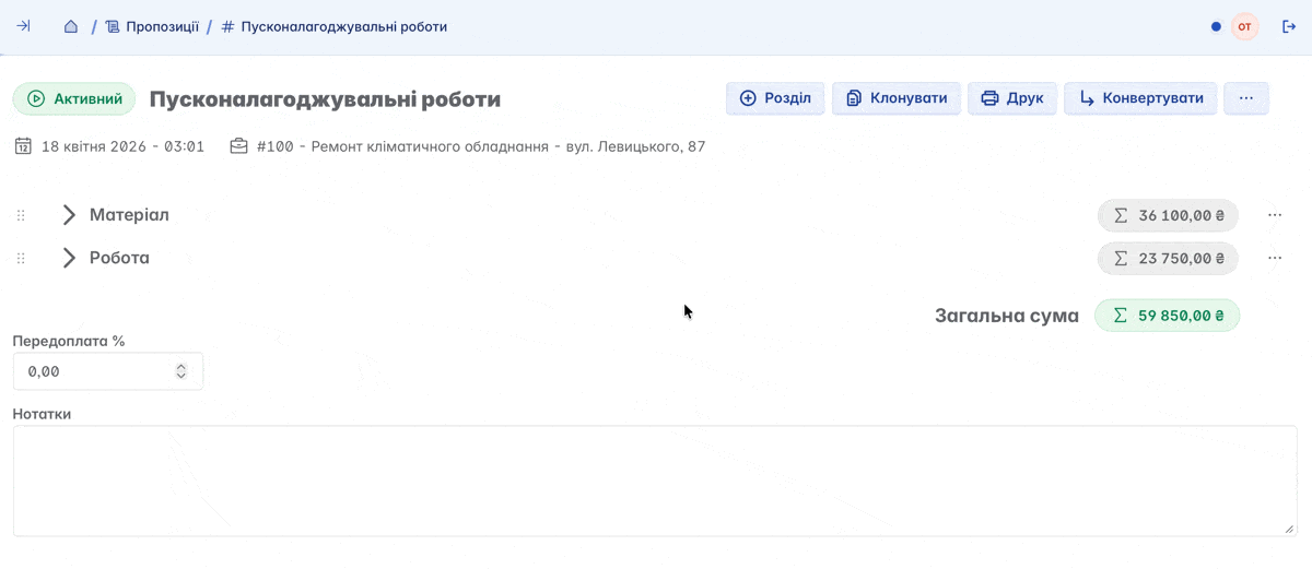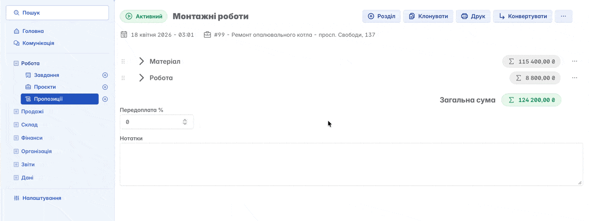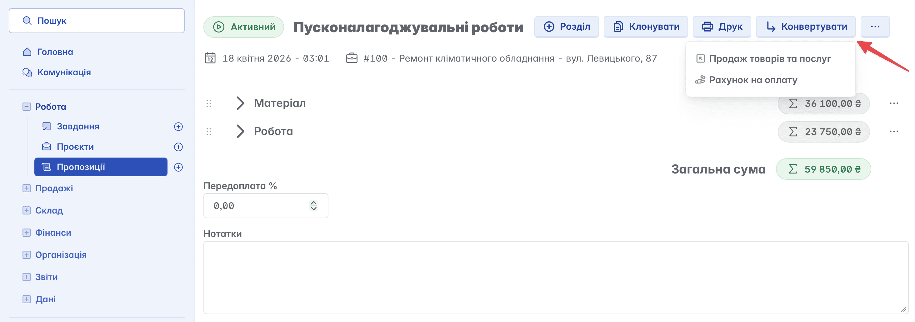 Як і розділ, пропозицію також можна конвертувати в документ. Основна відмінність полягає в тому, що під час конвертації всієї пропозиції вся номенклатура об’єднується в одному документі - як товари, так і послуги, тобто всі розділи і суми разом ( їх можна розділити вручну)
