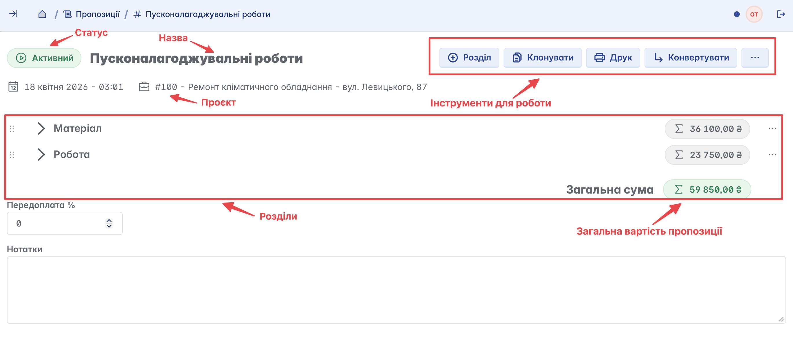 Головна сторінка пропозиції містить статус, назву, інформацію про проєкт (за наявності) та загальні інструменти для роботи, за допомогою яких можна клонувати, редагувати, роздрукувати, конвертувати пропозицію в документ або видалити її. Основним елементом пропозиції є "Розділ"