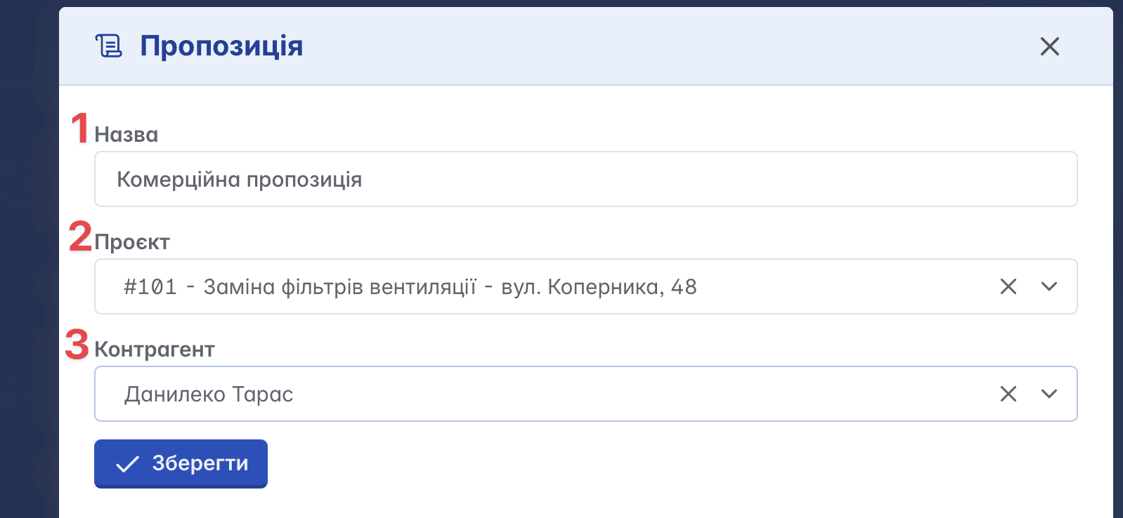 Проєкту - кщо пропозиція належить до конкретного проєкту, його можна обрати з переліку (поле необов’язкове)