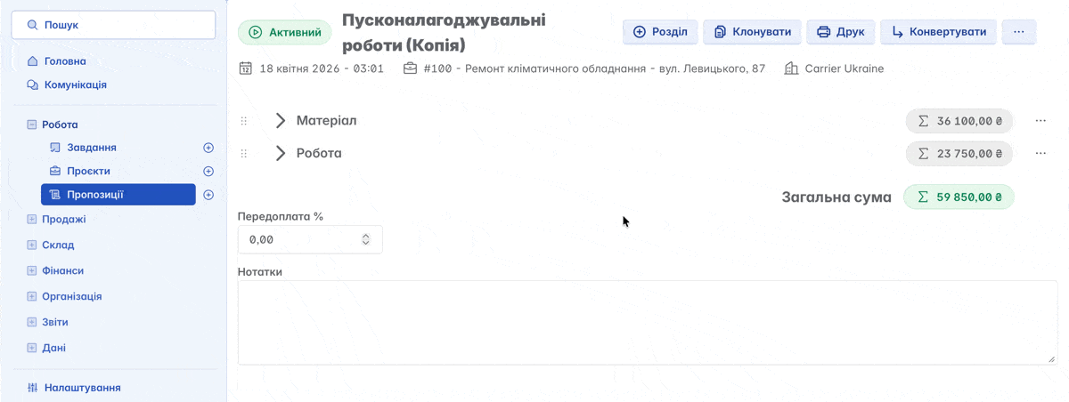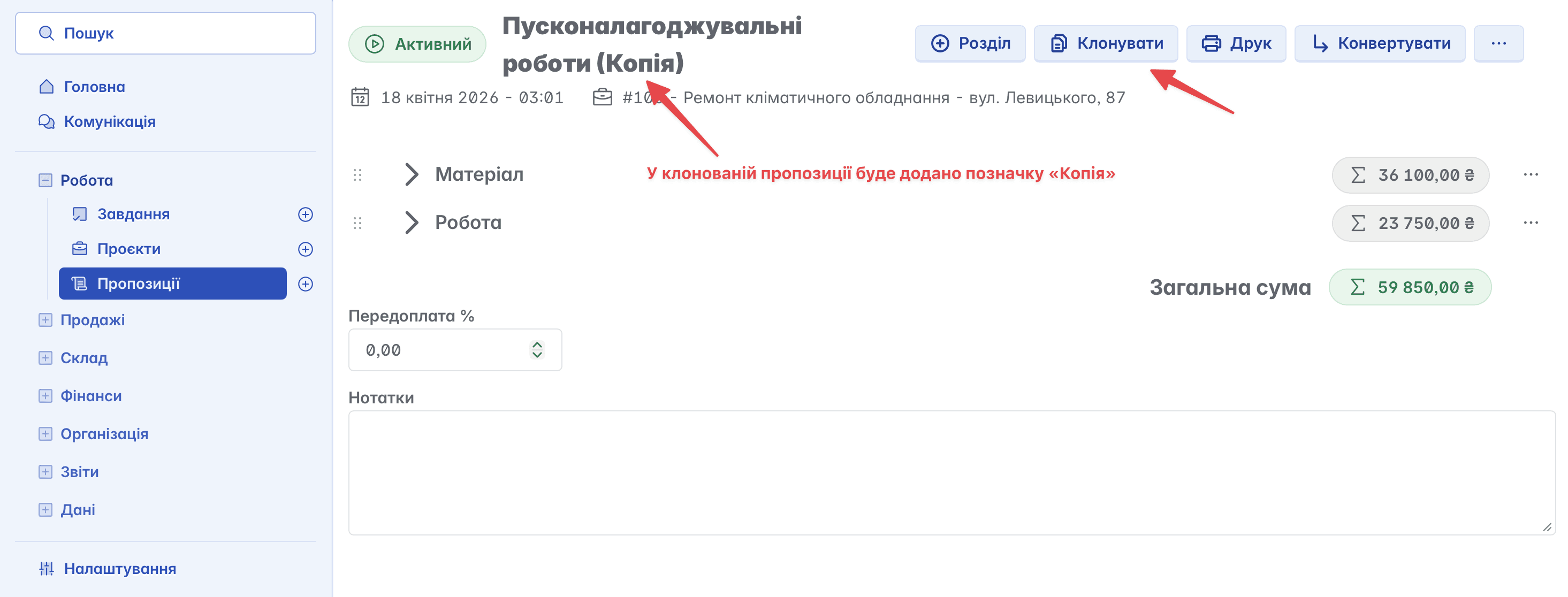 Щоб створити ідентичну пропозицію, скористайтеся функцією "Клонувати". Усі дані, окрім завдань, будуть перенесені в "Копію"