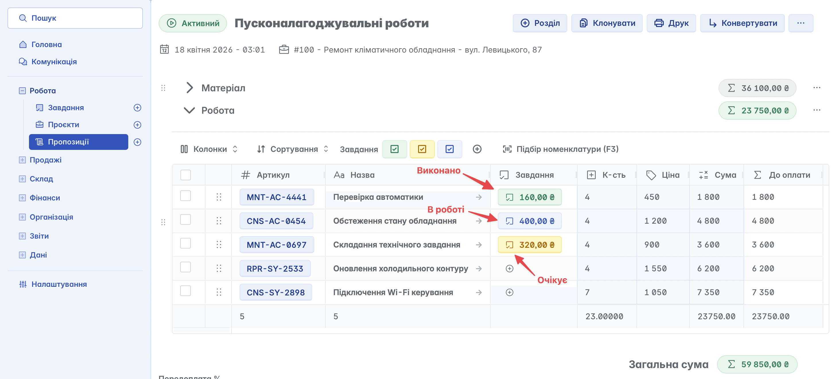У пропозиції можна створювати завдання для працівників. Наприклад, на замовлення товару або підготовку документації. Завдання можна створити як для розділу в цілому, так і для окремої номенклатури