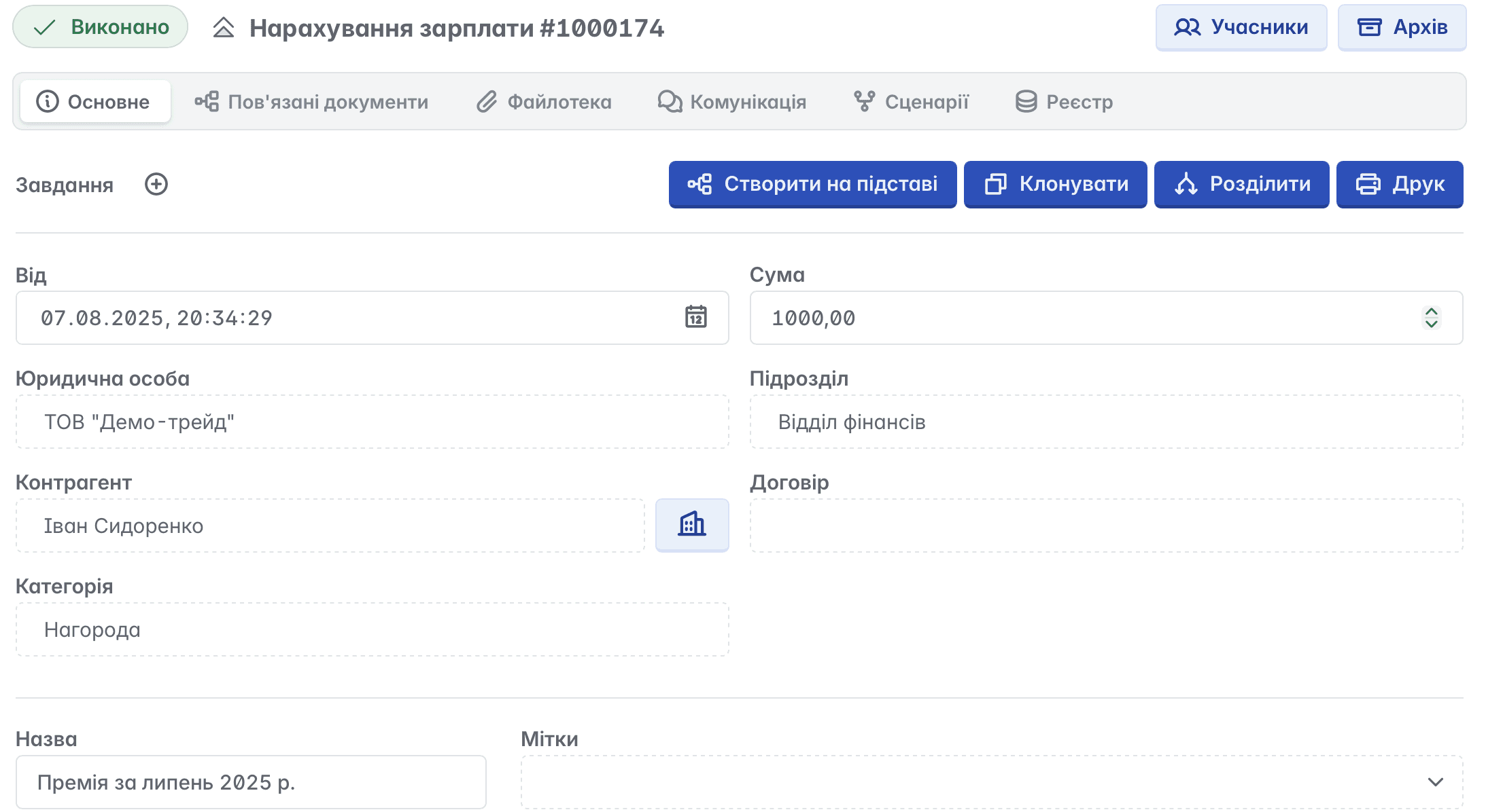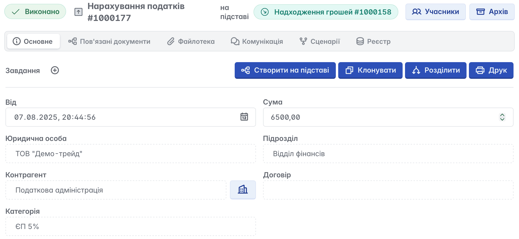 Створюється, коли потрібно зафіксувати зобов'язання перед фіскальними органами країни. Наразі податковий облік у Керуй™ представлений у максимально спрощеній формі