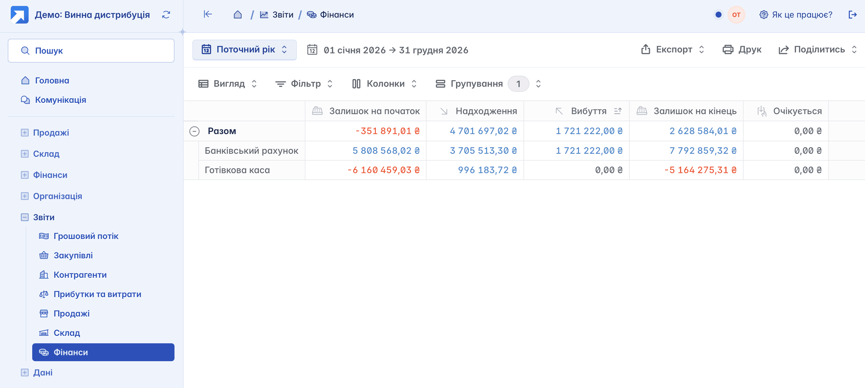 Цей звіт відображає загальну інформацію про фінансовий стан компанії: залишки на рахунках, рух коштів, зарезервовані суми та очікувані надходження чи витрати. Дозволяє оперативно оцінити доступність ресурсів і прогнозувати фінансові потреби