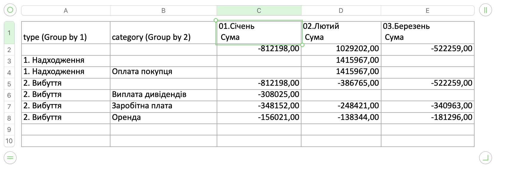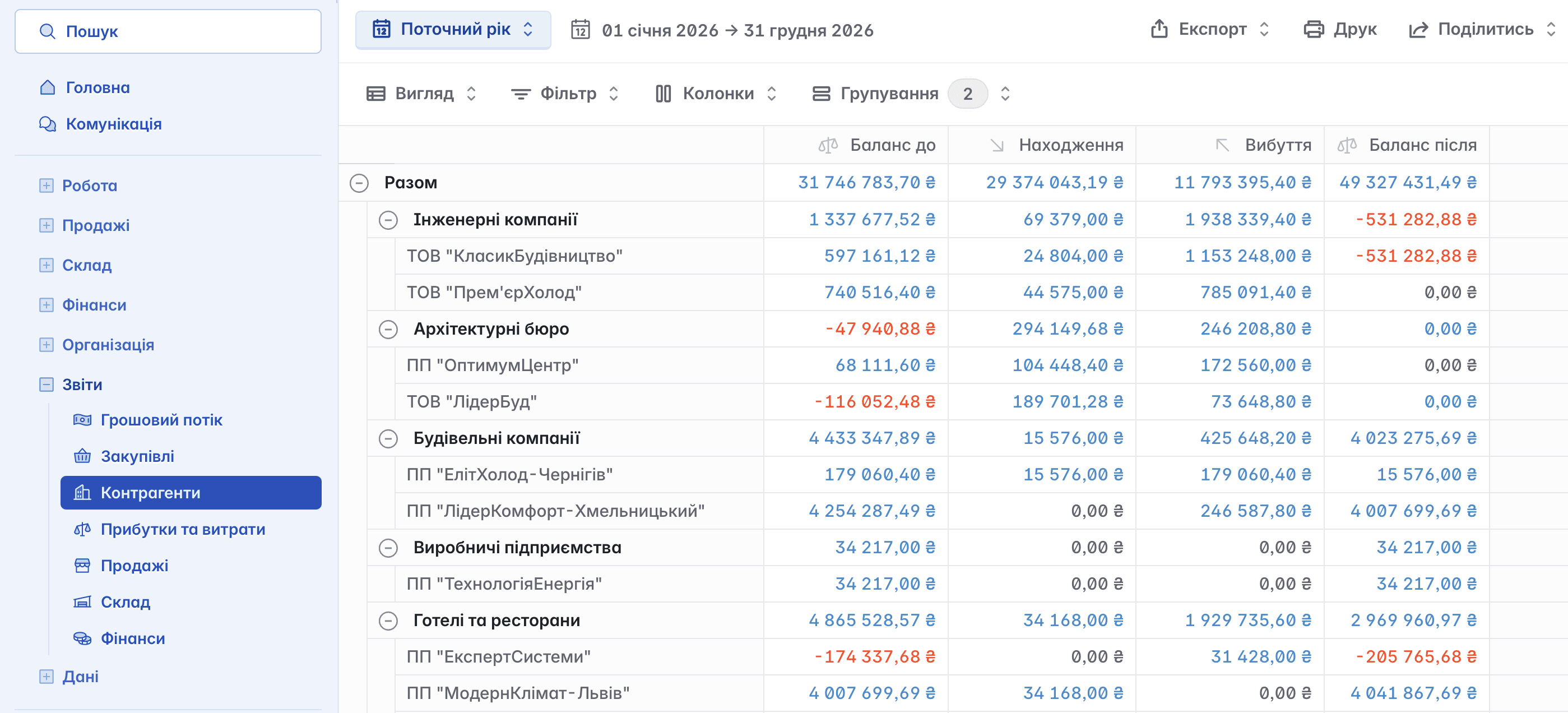 Даний звіт відображає фінансовий оборот по кожному контрагенту - постачальнику або клієнту. Показує залишок на початок періоду, суми надходжень і вибуття, а також залишок на кінець періоду. Дозволяє аналізувати ділову активність і взаєморозрахунки з партнерами