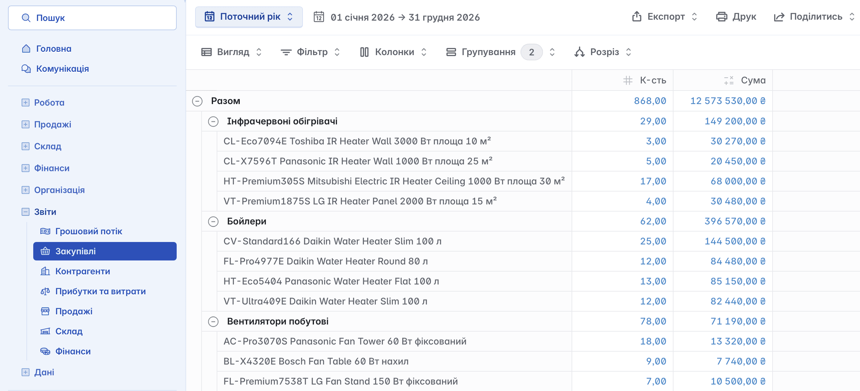 Звіт містить дані про всі проведені закупівлі товарів і послуг за обраний період. Дає змогу аналізувати витрати на закупівлі, перевіряти постачальників та контролювати ефективність закупівельної діяльності