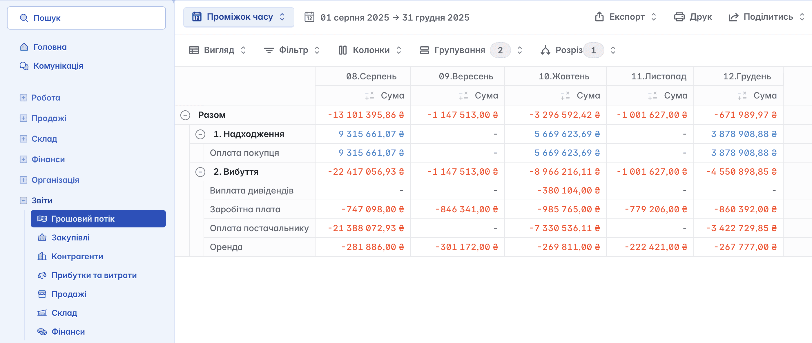 Цей звіт відображає всі надходження та вибуття фінансових коштів вашої компанії. Дані подаються за категоріями та у різних часових проміжках - за день, тиждень, місяць тощо. Завдяки цьому ви можете детально відстежувати рух грошей і контролювати фінансові операції