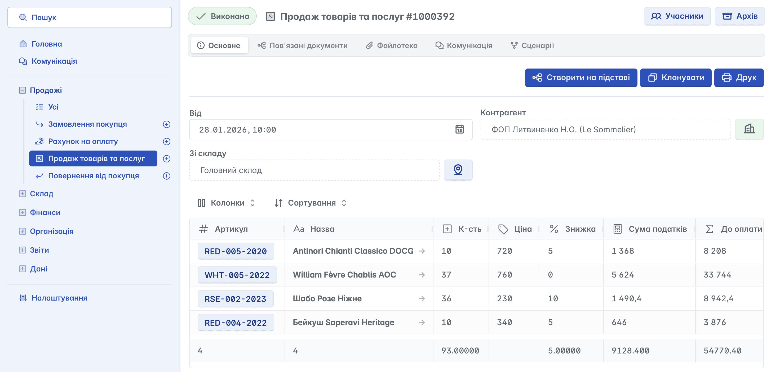 Документ, що підтверджує факт передачі права власності на товар або надання послуги клієнту за грошову винагороду. Може формуватися на підставі "Замовлення покупця"