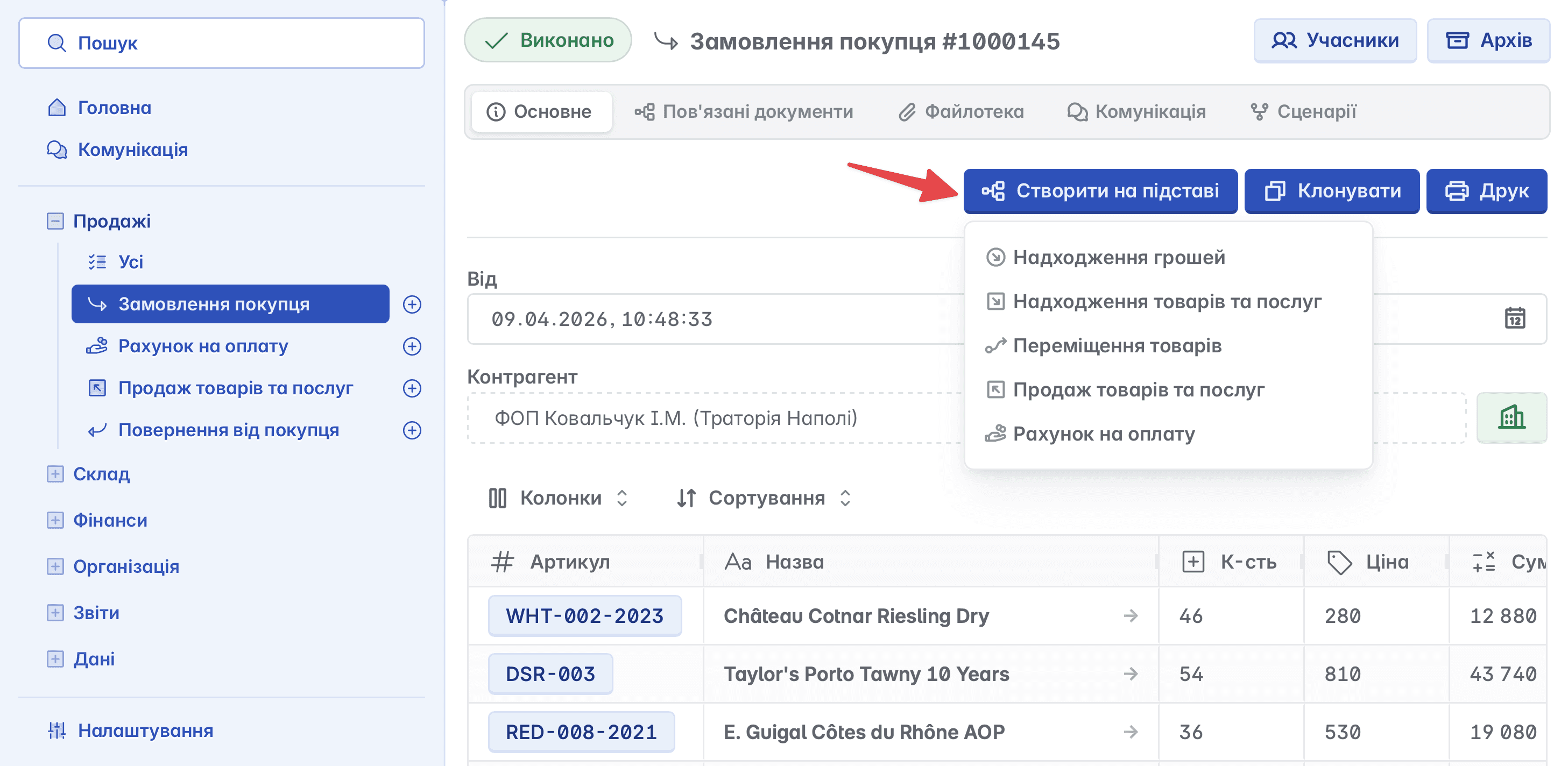 Оскільки всі модулі Керуй™ тісно взаємодіють між собою, документи продажу можна використовувати як основу для подальших операцій. На їх базі ви легко створюєте як фінансові, так і складські документи - зокрема "Надходження грошей" або "Надходження товарів та послуг", без дублювання даних і зайвих дій