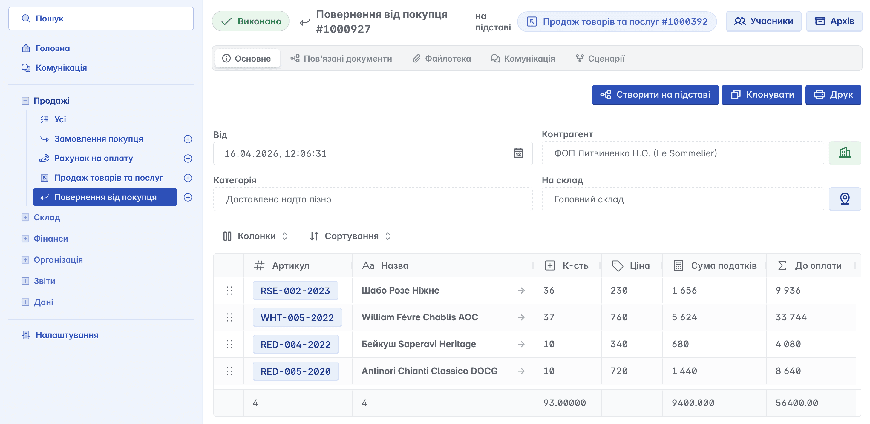Такий документ можна створити як окремо, так і на підставі вже оформленого документа "Продаж товарів та послуг". Номенклатура, зазначена у поверненні, автоматично зараховується на склад компанії