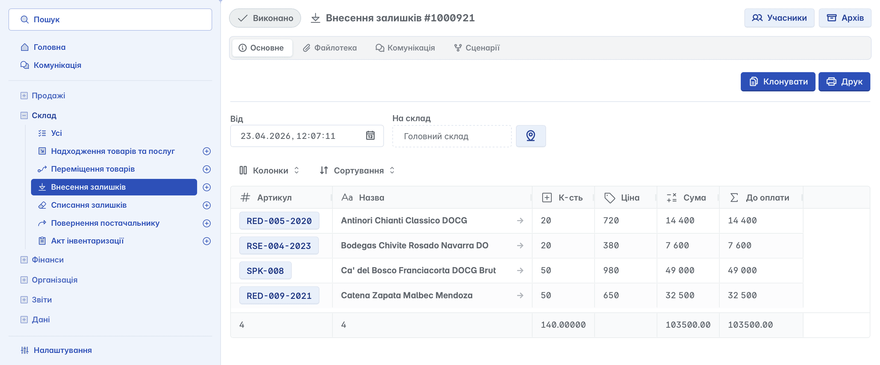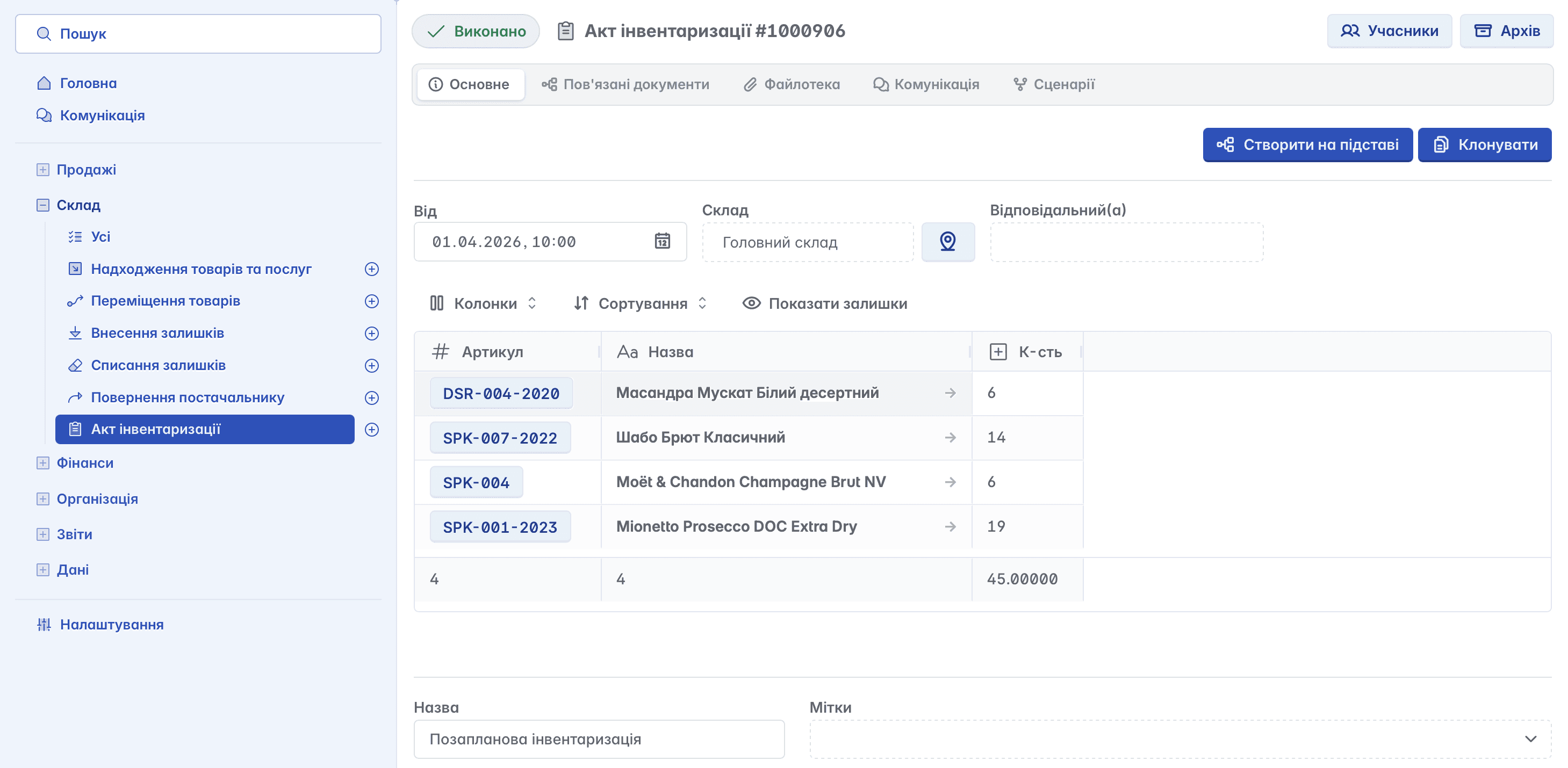 Для проведення інвентаризації у колонці "Кількість" необхідно вказати фактичну наявність товарів на складі. Сервіс автоматично розрахує різницю між обліковими та фактичними даними, що дозволяє оперативно виявити надлишки або нестачі та підготувати підставу для подальшого коригування залишків